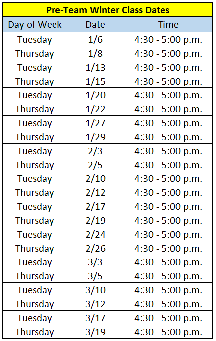 *The modified school swim team will be in season throughout this Pre-Team session. We don't anticipate any cancelations or rescheduling of class dates, but the Modified team does have first priority over the facility. In the event of a conflict, it will be communicated to the Pre-Team members.